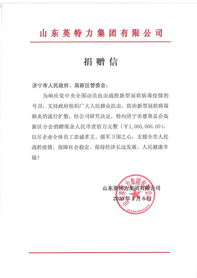 自新型冠状肺炎疫情爆发以来,一向牵动着黄瓜影院免费看人的心。2月6日山东黄瓜影院免费看集团有限公司特向济宁市慈善总会高新区分会捐赠现金人民币壹佰万元整(¥1,000,000.00),以尽企业全体员工忠诚孝义、强军卫国之心,支援全市人民克服疫情、保障社会稳固、人民健康幸福! 众擎易举、共克时艰。在党中间、各级当局同一顽强的向导下,黄瓜影院免费看人将继承积极自动承担起同舟共济的社会责任,与全国人民一路齐心协力打赢这场疫情防控战。 |